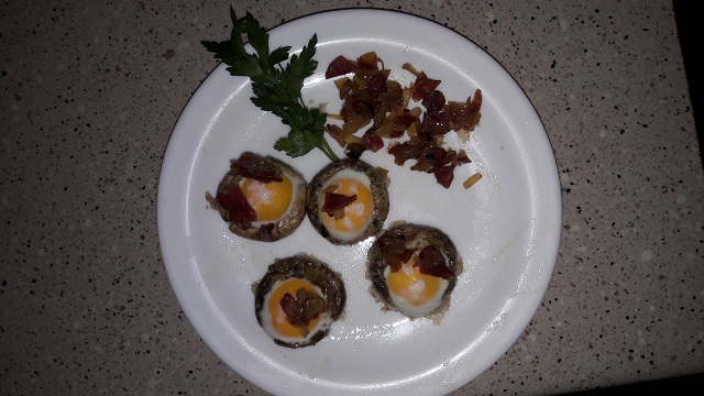 Seguidamente ponemos un huevo de codorniz en cada champiñon y horneamos entre 170 y 220 grados para cuajarlos.