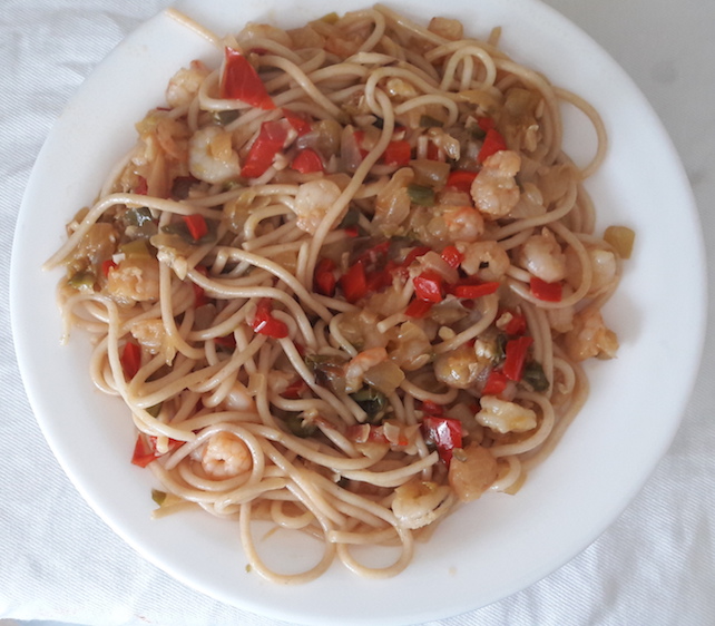 Cuando los espaguetis estén hechos, los colaremos y les pasaremos agua fría. Cuando esté el salteado de verduras con las gambas agregaremos los espaguetis.