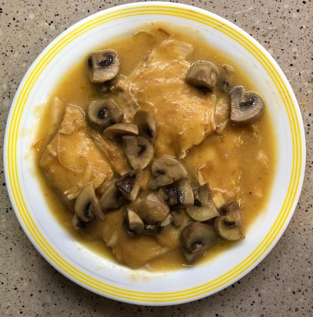½ kg de pechuga de pavo 2 cebollas 1 puerro grande 1 zanahoria grande ½ Kg de champiñones Ajo Laurel Pimienta Aceite Sal 1 vaso de coñac