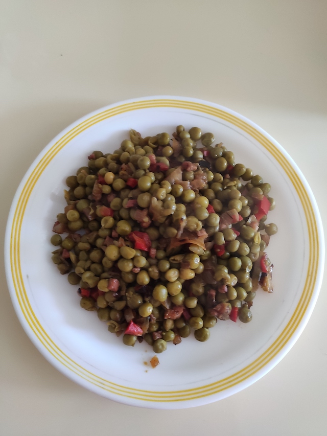 Coceremos los garbanzos y si se prefiere se puede utilizar garbanzos de bote (antes de su utilización los habremos puesto en un colador y lo pasaremos por agua para quitar los conservantes y aditivos). Se lavan y se cortan todas las verduras a trocitos pequeños. A continuación, se ponen en una sartén con muy poco aceite y se saltearan, removiéndola de vez en cuando. Cuando estén casi hechas le agregaremos los lomos de bacalao y se irán removiendo las verduras y daremos la vuelta al bacalao (aprovecharemos esto para quitarle la piel). Una vez esté hecho el bacalao y las verduras agregaremos los garbanzos y lo removeremos todo dejándolo unos cinco minutos más.